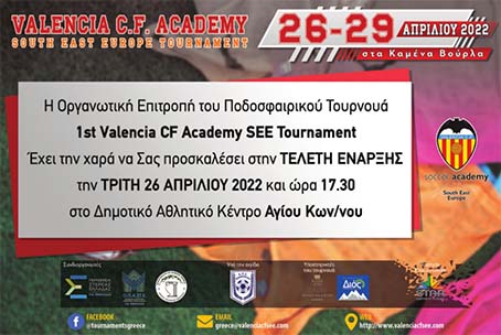 26-29/4/2022 θα πραγματοποιηθεί το Ποδοσφαιρικό Τουρνουά 1st Valencia CF Academy SEE Tournament στον Άγιο Κωνσταντίνο.
