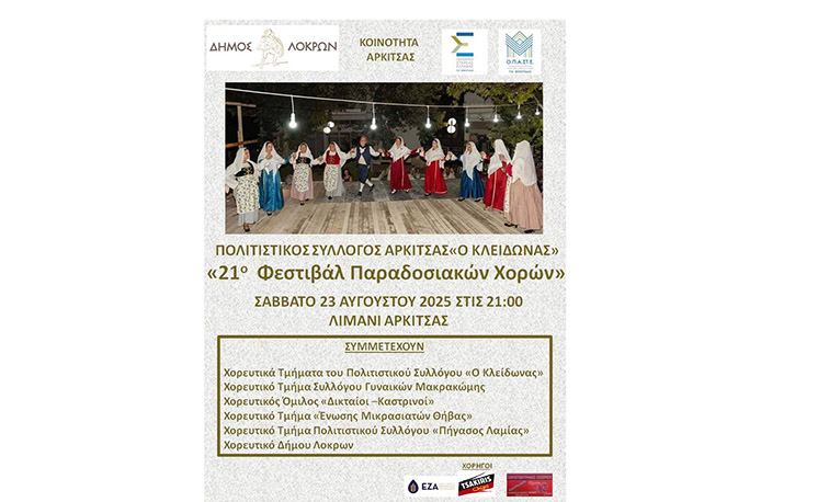 To 21ο Φεστιβάλ Παραδοσιακών Χορών θα πραγματοποιηθεί στο λιμάνι της Αρκίτσας το Σάββατο 23 Αυγούστου 2025 στις 21:00.