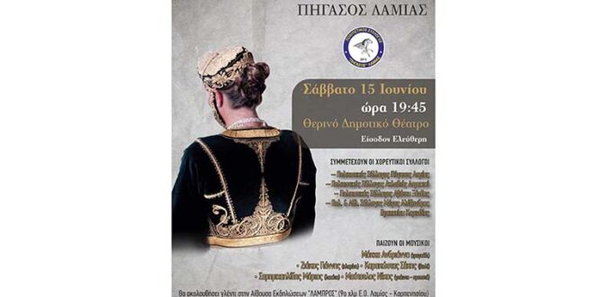 Το 2ο Φεστιβάλ παραδοσιακών χορών Λαμίας πραγματοποιεί ο δραστήριος Πολιτιστικός Σύλλογος Πήγασος Λαμίας και μας προσκαλεί το Σάββατο 15 Ιουνίου στο θερινό Δημοτικό θέατρο ωρα 7:45μμ.