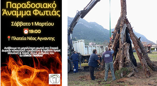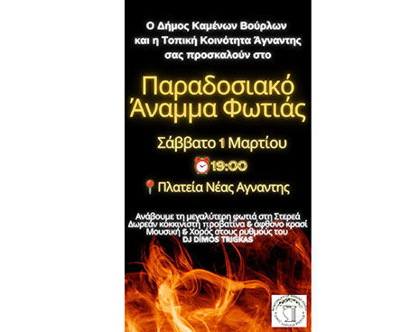 Το Σάββατο 1η Μαρτίου και ώρα 19:00, όπως αναφέρει ο Δήμος Καμένων Βούρλων, “σας περιμένουμε στην πλατεία της Νέας Άγναντης για να πούμε «καλό μήνα» και να υποδεχτούμε την άνοιξη με την πιο μεγάλη φωτιά της Φθιώτιδας.”