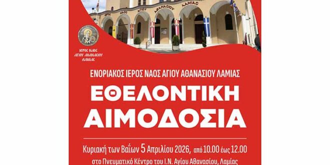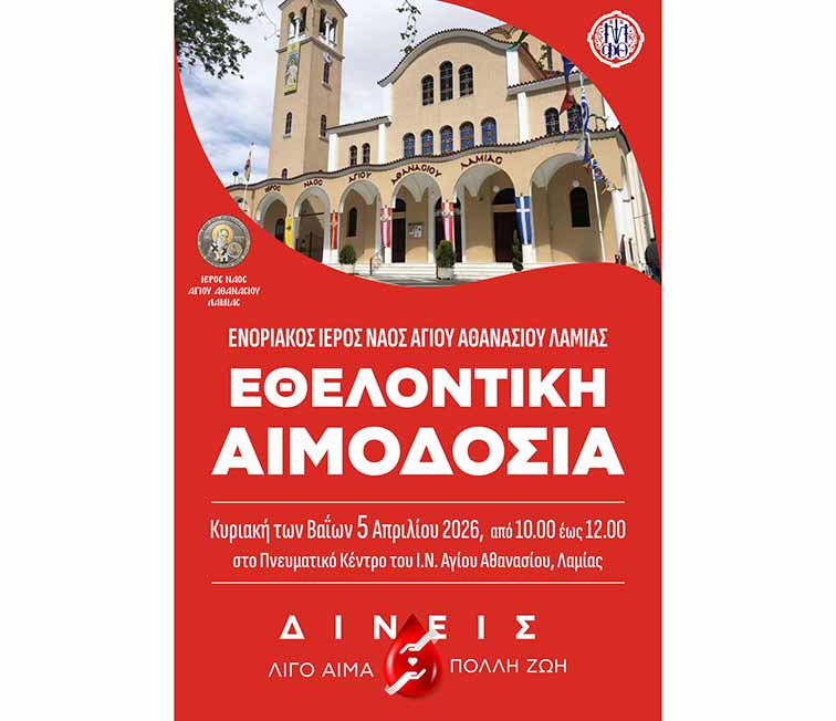Αιμοδοσία – μια πράξη Αγάπης. Κυριακή των Βαΐων 5 Απριλίου 2026 στο Πνευματικό Κέντρο του Ιερού Ναού Αγίου Αθανασίου στα Γαλανέικα Λαμίας.