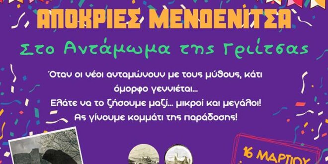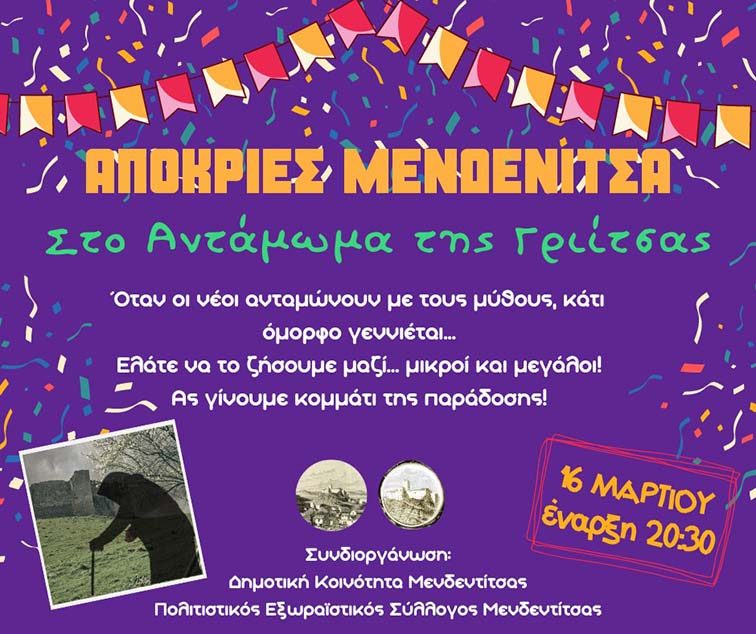 “Το αντάμωμα της γριίτσας” θα μας παρουσιάσει ο Πολιτιστικός – Εξωραϊστικός Σύλλογος Μενδενίτσας, στις 16/3/2024, στα πλαίσια των αποκριάτικων εκδηλώσεων που συνδιοργανώνονται με την Κοινότητα Μενδενίτσας.