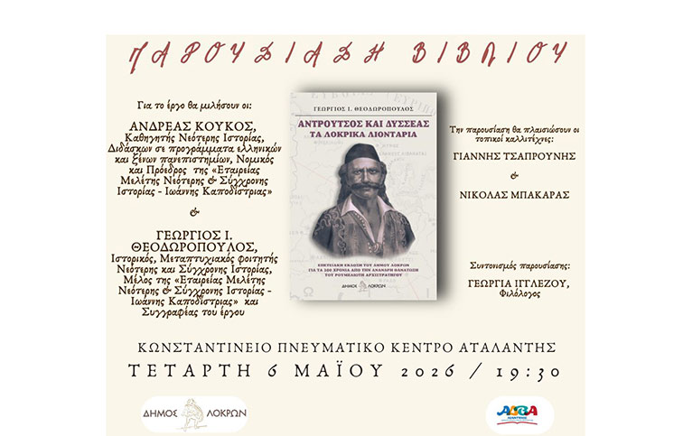 Παρουσίαση βιβλίου “Αντρούτσος και Δυσσέας – Τα Λοκρικά Λιοντάρια” θα πραγματοποιηθεί στο Κωνσταντίνειο Πνευματικό Κέντρο Αταλάντης την Τετάρτη 6 Μαΐου 2026 στις 19:30.