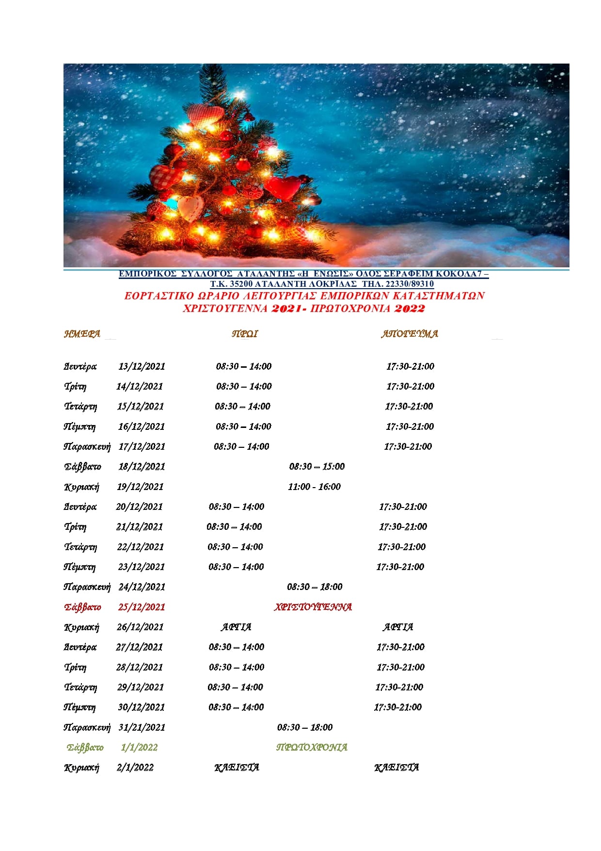Δείτε το εορταστικό ωράριο Χριστουγέννων & Πρωτοχρονιάς, όπως το ανακοίνωσε ο Εμπορικός Σύλλογος Αταλάντης “ΕΝΩΣΗΣ”