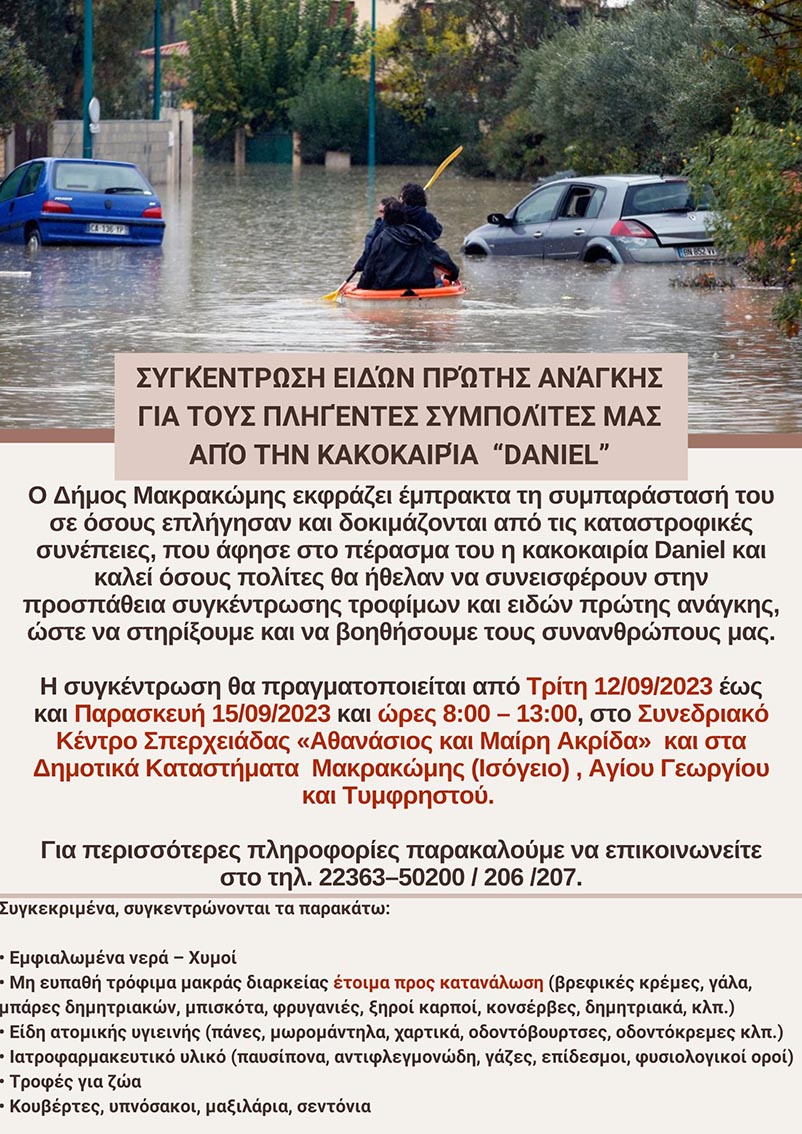 Ο Δήμος Μακρακώμης συγκεντρώνει είδη πρώτης ανάγκης για τους πληγέντες συμπολίτες μας από την κακοκαιρία “DANIEL”