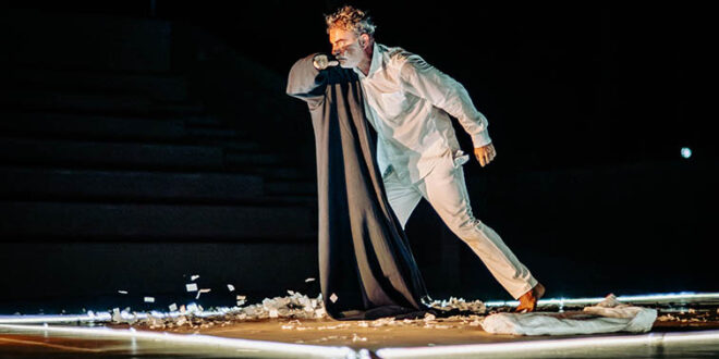 Η παράσταση, σε σκηνοθεσία της Έλενας Αγγελοπούλου, φωτίζει την υπαρξιακή αγωνία του ήρωα µε τα εργαλεία του σύγχρονου θεάτρου: ηλεκτρονική μουσική, διαρκή κίνηση, έντονο ρυθµό, ηχητικά – κινηµατογραφικά τοπία και το φως δυνατό συμπαίκτη. Στοιχεία που αναδεικνύουν το μεγάλο ερώτημα της αναζήτησης του νοήματος της ύπαρξης.