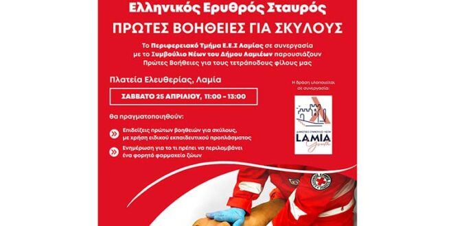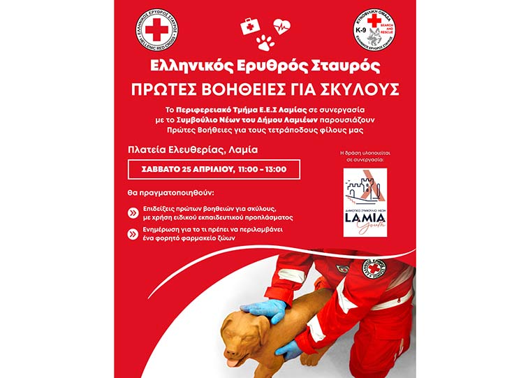 Δράση διοργανώνει το Περιφερειακό Τμήμα Λαμίας του Ελληνικού Ερυθρού Σταυρού σε συνεργασία με το Συμβούλιο Νέων του Δήμου Λαμιέων, με θέμα “Βασικές Γνώσεις Πρώτων Βοηθειών για Σκύλους”.