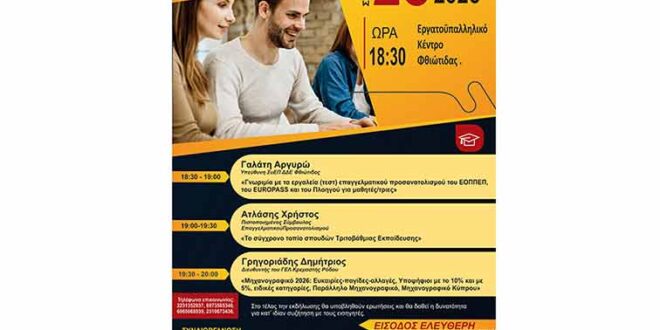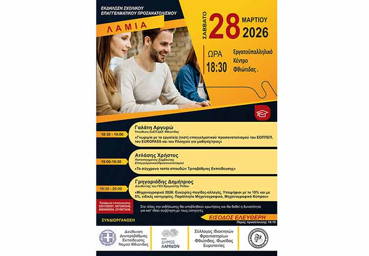 Η Διεύθυνση Δευτεροβάθμιας Εκπαίδευσης Νομού Φθιώτιδας, ο Δήμος Λαμιέων, ο Σύλλογος Ιδιοκτητών Φροντιστηρίων Φθιώτιδας, Φωκίδας και Ευρυτανίας και ο Εξωραϊστικός Σύλλογος “Η Νέα Βράχα”, αναγνωρίζοντας την ανάγκη για συνεχή ενημέρωση μαθητών/ριών και γονέων σχετικά με θέματα επαγγελματικού προσανατολισμού, διοργανώνουν εκδήλωση το Σάββατο 28 Μαρτίου 2026 στις 18:30 στο «Εργατοϋπαλληλικό κέντρο» Φθιώτιδας .