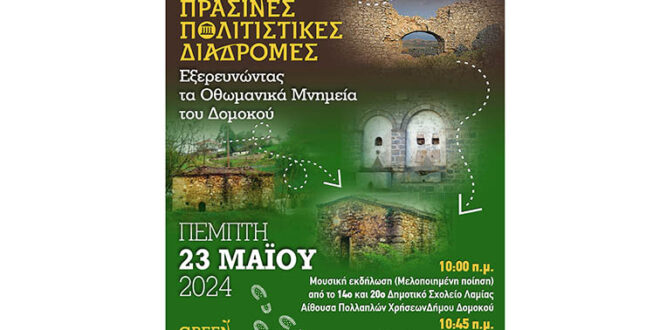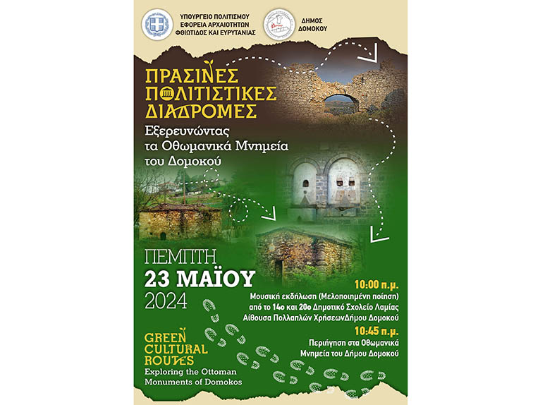 Την Πέμπτη 23/5/2024 θα πραγματοποιηθούν πολιτιστικές εκδηλώσεις με επίκεντρο τα Οθωμανικά μνημεία του Δήμου Δομοκού