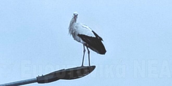 Ένα σπάνιο αλλά ταυτόχρονα πανέμορφο θέαμα προσέφερε ένας πελαργός που εμφανίστηκε στο Καρπενήσι, καθισμένος σε φωτιστικό δρόμου, με φόντο τα χιονισμένα βουνά.