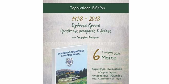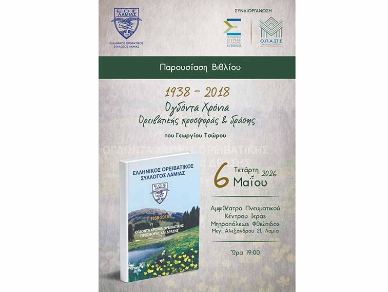 “Ο Ελληνικός Ορειβατικός Σύλλογος Λαμίας έχει τη χαρά και την τιμή να ανακοινώσει τη παρουσίαση του βιβλίου του πρώην Προέδρου του συλλόγου κ. Γεωργίου Τσώρου «1938-2018 – Ογδόντα Χρόνια Ορειβατικής Προσφοράς και Δράσης», η οποία θα πραγματοποιηθεί την Τετάρτη 6 Μαΐου 2026, στο Αμφιθέατρο του Πνευματικού Κέντρου της Ιεράς Μητρόπολης Φθιώτιδας.