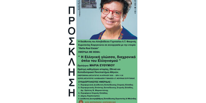 Η Περιφερειακή Διεύθυνση Εκπαίδευσης Στερεάς Ελλάδας και ο Περιφερειακός Επόπτης Εκπαίδευσης Στερεάς Ελλάδας, σε συνεργασία με το Αλικιβιάδειο Γυμνάσιο με Λυκειακές Τάξεις Φουρνάς Ευρυτανίας, τις Διευθύνσεις Δευτεροβάθμιας Εκπαίδευσης Ευρυτανίας και Φθιώτιδας, την Περιφέρεια Στερεάς Ελλάδας και τον Δήμο Καρπενησίου και υπό την αιγίδα του Σεβασμιωτάτου Μητροπολίτη Καρπενησίου κ.κ. Γεωργίου, διοργανώνουμε Επιμορφωτική Ημερίδα με θέμα: «Η Ελληνική Γλώσσα, διαχρονικό όπλο του Ελληνισμού»
