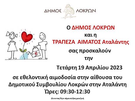Εθελοντική Αιμοδοσία στην αίθουσα του Δημοτικού Συμβουλίου του Δήμου Λοκρών στην Αταλάντη την Τετάρτη 19 Απριλίου 2023 μεταξύ 09:30-12:30.