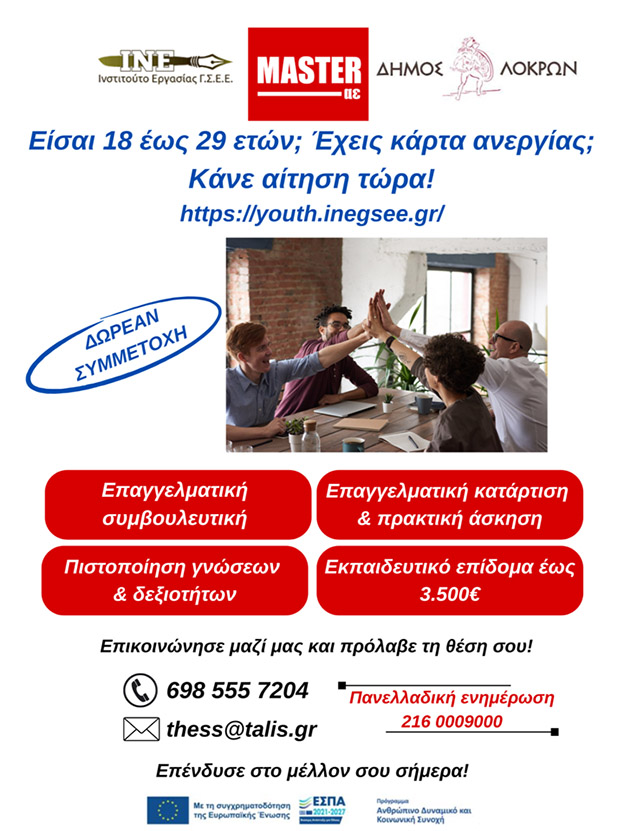 Δωρεάν σεμινάρια επαγγελματικής κατάρτισης για ανέργους ηλικίας 18-29 ετών στο Δήμο Λοκρών