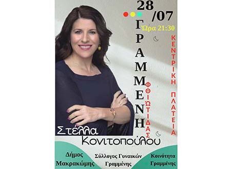 Η Στέλλα Κονιτοπούλου την Παρασκευή 28 Ιουλίου 2023 θα μας παρουσιάσει μια αξέχαστη μουσική βραδιά στην Κοινότητα Γραμμένης, ταξιδεύοντάς μας, σε νησιώτικα μονοπάτια με ρυθμούς και μουσικές που αποπνέουν θαλασσινό άρωμα.