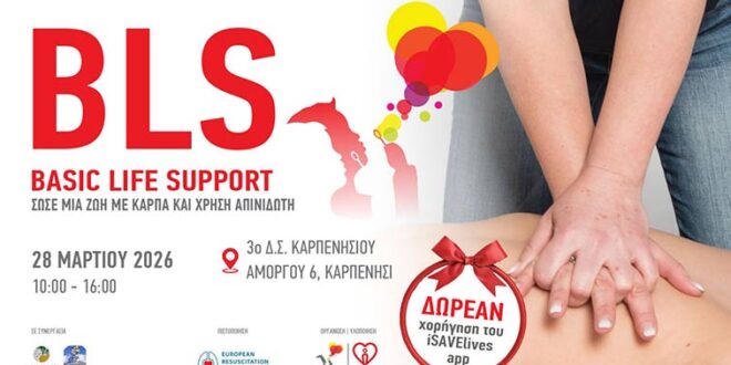 Το Σάββατο 28 Μαρτίου, από τις 10:00 έως τις 16:00, θα πραγματοποιηθεί στο Καρπενήσι πιστοποιημένο σεμινάριο Βασικής Υποστήριξης Ζωής (Basic Life Support – BLS), στο 3ο Δημοτικό Σχολείο Καρπενησίου (Αμοργού 6).