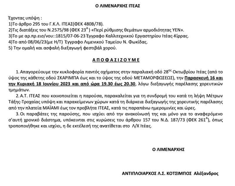 Κυκλοφοριακές ρυθμίσεις στην Ιτέα την Παρασκευή 16 και Κυριακή 18 λόγω παρέλασης χορευτικών τμημάτων