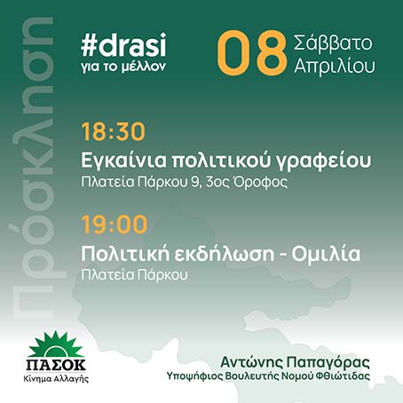 Το Σάββατο 8 Απριλίου, στην Πλατεία Πάρκου 9 και ώρα 18:30, θα πραγματοποιηθούν τα εγκαίνια του πολιτικού γραφείου του υποψηφίου βουλευτή Φθιώτιδας με το ΠΑΣΟΚ – Κίνημα Αλλαγής, Αντώνη Παπαγόρα.