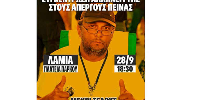 «Μέχρι Τέλους» το βασικό σύνθημα της συγκέντρωσης αλληλεγγύης Για τους απεργούς πείνας για την τραγωδία των Τεμπών θα πραγματοποιηθεί συγκέντρωση αλληλεγγύης την Κυριακή 28 Σεπτεμβρίου 2025 στη Λαμία. Η συγκέντρωση αλληλεγγύης συγκεκριμένα θα πραγματοποιηθεί στις 18:30, στην πλατεία Πάρκου. Η αφίσα για την συγκέντρωση με το σύνθημα «Μέχρι Τέλους».