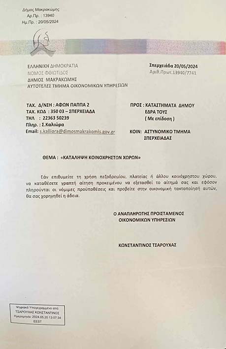 Έγγραφο απέστειλε η Οικονομική Υπηρεσία του Δήμου Μακρακώμης, και συγκεκριμένα ο Αναπληρωτής Προϊστάμενος της, προς τους επαγγελματίες του Δήμου με τίτλο «Κατάληψη κοινόχρηστων χώρων».