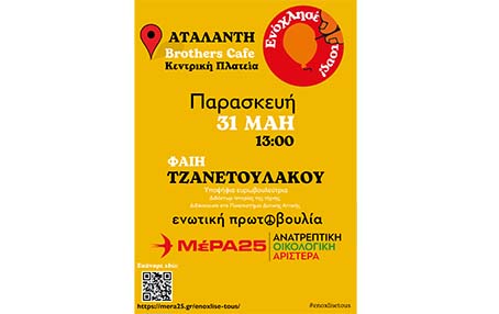 Η υποψήφια Ευρωβουλεύτρια, Διδάκτωρ Ιστορίας της τέχνης, Διδάσκουσα στο Πανεπιστήμιο Δυτικής Αττικής και ακτιβίστρια για το περιβάλλον Φαίη Τζανετουλάκου θα βρεθεί τη Παρασκευή 31 Μάη από το πρωί σε περιοδεία στην Αταλάντη και στις 13:00 θα πραγματοποιήσει συνάντηση συζήτηση με πολίτες της περιοχής στο Brothers cafe στη Κεντρική Πλατεία της πόλης.