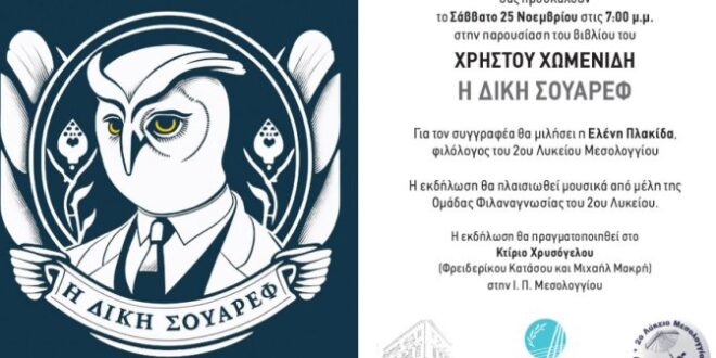 Ο Τομέας Πολιτισμού της ΠΔΕ σε συνδιοργάνωση με την ομάδα φιλαναγνωσίας του 2ου ΓΕΛ Μεσολογγίου και τις εκδόσεις Πατάκη σας προσκαλούν στην παρουσίαση του νέου μυθιστορήματος του Χρήστου Χωμενίδη με τίτλο «Η ΔΙΚΗ ΣΟΥΑΡΕΦ», που θα πραγματοποιηθεί το Σαββάτο 25 Νοεμβρίου 2023 και ώρα 19.00, στο Κτίριο Χρυσόγελου.