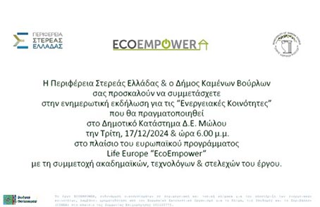 Ο Δήμος Καμένων Βούρλων και η Περιφέρεια Στερεάς Ελλάδας σας προσκαλούν στην ενημερωτική εκδήλωση για τις «Ενεργειακές Κοινότητες», που θα πραγματοποιηθεί στο Δημοτικό Κατάστημα Δ.Ε. Μώλου, την Τρίτη 17.12.24 και ώρα 18:00μ.μ στο πλαίσιο του ευρωπαϊκού προγράμματος Life Europe «Ecoempower» με τη συμμετοχή ακαδημαϊκών, τεχνολόγων και στελεχών του έργου.