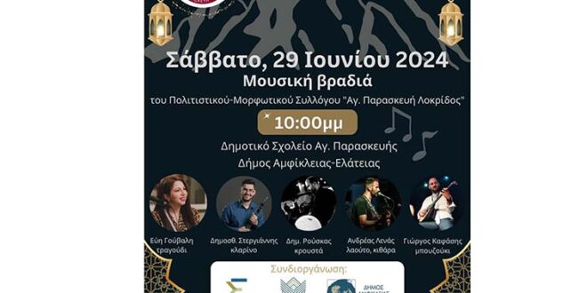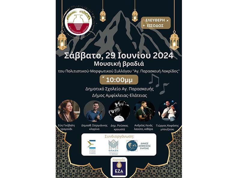 Ο Πολιτιστικός – Μορφωτικός Σύλλογος «Αγία Παρασκευή Λοκρίδος» μας προσκαλεί στη «Μουσική Βραδιά», που διοργανώνει το Σάββατο 29 Ιουνίου 2024 και ώρα 10:00μ.μ. στο προαύλιο του Δημοτικού Σχολείου της Αγίας Παρασκευής.