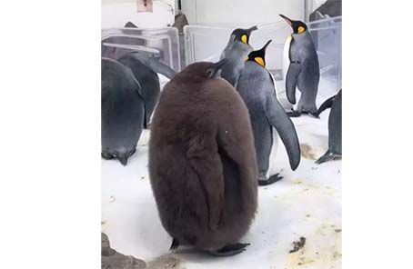 Ο «Άτλας» πιγκουίνος πολύ σύντομα θα χάσει τα καφέ βρεφικά πούπουλά του και θα αποκτήσει τη χαρακτηριστική κίτρινη λωρίδα στο κεφάλι και το ασπρόμαυρο χρώμα που θυμίζει σμόκιν.
