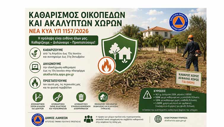 Με αφορμή τη δημοσίευση της Κοινής Υπουργικής Απόφασης ΥΠ 1157/2026 (ΦΕΚ 2323/Β/24‑4‑2026), το Αυτοτελές Τμήμα Πολιτικής Προστασίας του Δήμου Λαμιέων υπενθυμίζει στους πολίτες – ιδιοκτήτες, νομείς, επικαρπωτές, μισθωτές και υπομισθωτές– τις υποχρεώσεις τους σχετικά με την προληπτική πυροπροστασία οικοπεδικών και λοιπών ακάλυπτων χώρων, για την αποφυγή κινδύνου πρόκλησης ή ταχείας επέκτασης πυρκαγιάς.
