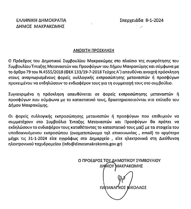 Ανοιχτή πρόσκληση προς αναγνωρισμένους φορείς συλλογικής εκπροσώπησης μεταναστών ή προσφύγων για συγκρότηση συμβουλίου ένταξης μεταναστών και προσφύγων του Δήμου Μακρακώμης