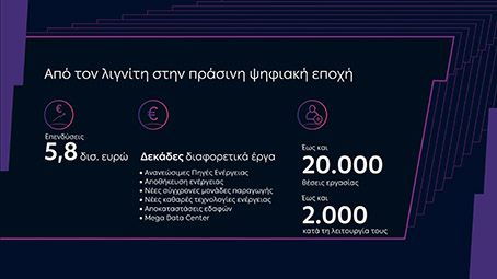 Ο Όμιλος ΔΕΗ θα υλοποιήσει συνολικά δεκάδες έργα στη Δυτική Μακεδονία που θα δημιουργήσουν έως και 20.000 θέσεις εργασίας κατά την κατασκευή και έως 2,000 θέσεις κατά τη λειτουργίασε πλήρη ανάπτυξη όλων των σχεδίων.
