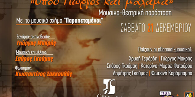 Ο δεξιοτέχνης του μπουζουκιού, μουσικός Σπύρος Γκούμας και το μουσικό σχήμα «Παραπεταμένοι», γνωστοί για τη συνεχή και συνεπή τους ενασχόληση με το αστικό λαϊκό μας τραγούδι, παρουσιάζουν μία θεατρική-μουσική παράσταση με τίτλο «Όπου Γιώργος και μάλαμα», όπου συμμετέχουν σε μια διαρκή σύμπραξη ηθοποιοί και μουσικοί αποτυπώνοντας λιτά δραματοποιημένα στοιχεία από την Αυτοβιογραφία του Γιώργου Μητσάκη.
