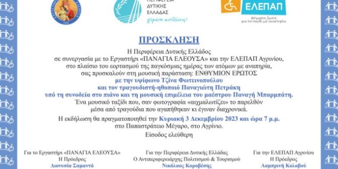 Η Μουσική παράσταση: ΕΝΘΥΜΙΟΝ ΕΡΩΤΟΣ, θα πραγματοποιηθεί από την Περιφέρεια Δυτικής Ελλάδας σε συνεργασία με το Εργαστήρι ¨ΠΑΝΑΓΙΑ ΕΛΕΟΥΣΑ” και την ΕΛΕΠΑΠ Αγρινίου, στο πλαίσιο του εορτασμού της παγκόσμιας ημέρας ατόμων με αναπηρία.