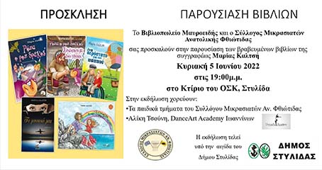 Το Βιβλιοπωλείο Μαυροειδής σε συνεργασία με τον Σύλλογο Μικρασιατών Ανατολικής Φθιώτιδας σας προσκαλούν στην παρουσίαση των βραβευμένων βιβλίων της συγγραφέως Μαρίας Καλτσή την Κυριακή Ιουνίου ώρα 19:00 μ.μ. στο Κτίριο του ΟΣΚ, Στυλίδα.