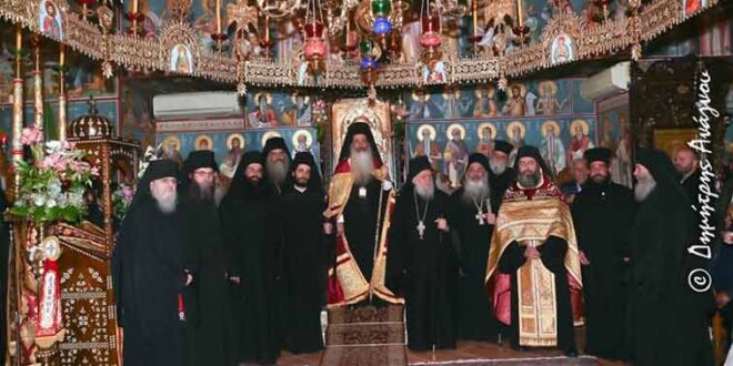 Τέλος, σήμερα το απόγευμα ο κ. Συμεών χοροστάτησε πανηγυρικά στην Ιερά Μονή Μεταμορφώσεως Σωτήρος Αγιάς Καμένων Βούρλων, πλαισιούμενος από τον γέροντα της Μονής, Καθηγούμενο Αρχιμ. π. Σεραφείμ Μαργαρίτου και με τη συμμετοχή πλειάδος Καθηγουμένων και λοιπών πατέρων.