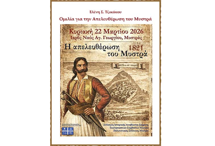 Ο Σύλλογος Ιστορικής Αναβίωσης Σπάρτης, σε συνεργασία με το Εκκλησιαστικό Συμβούλιο Μυστρά, τίμησαν με σεμνότητα και υπερηφάνεια την απελευθέρωση του Μυστρά από την Οθωμανική Αυτοκρατορία τον Μάρτιο του 1821, με μία επετειακή εκδήλωση μνήμης που πραγματοποιήθηκε την Κυριακή 22 Μαρτίου 2026.