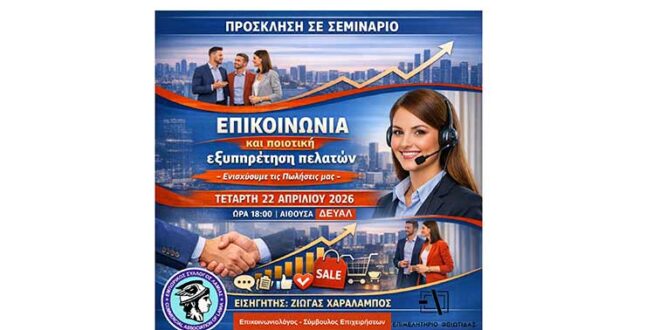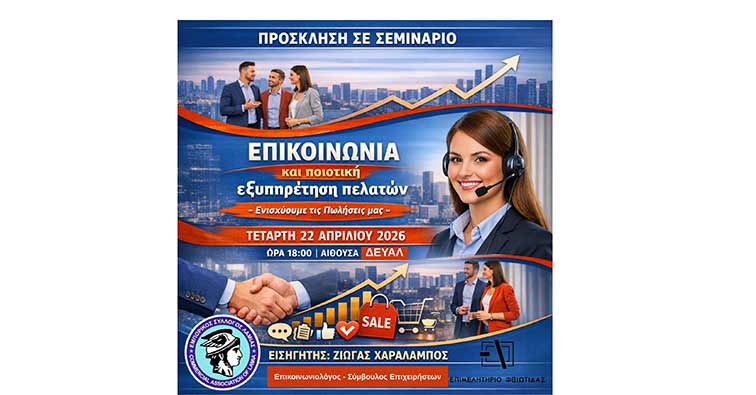 Ο Εμπορικός Σύλλογος Λαμίας σε συνδιοργάνωση με το Επιμελητήριο Φθιώτιδος, με στόχο την ουσιαστική στήριξη των τοπικών επιχειρήσεων και την αναβάθμιση της αγοραστικής εμπειρίας στην πόλη μας διοργανώνει ένα σεμινάριο εκπαίδευσης με θέμα ” Σύγχρονες τεχνικές πωλήσεων & ποιοτική εξυπηρέτηση πελατών“.