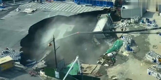 Στα πλάνα φαίνεται να υποχωρεί ξαφνικά το έδαφος και η τεράστια τρύπα να καταπίνει τα πάντα, μέχρι και τα κοντέινερ του εργοταξίου, ενώ οι εργάτες τρέχουν πανικόβλητοι να σωθούν.