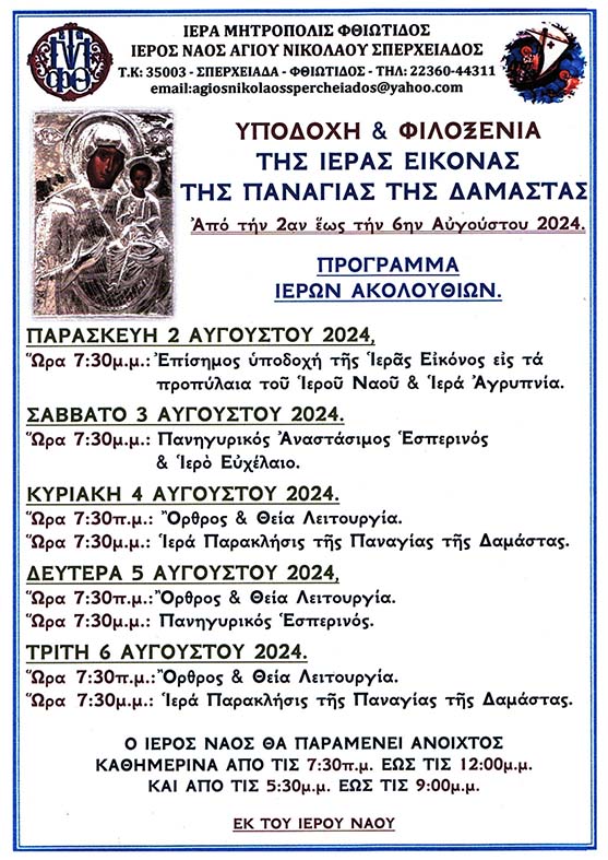 Την Παρασκευή 2/8/2024, η Σπερχειάδα υποδέχεται και φιλοξενεί για πέντε ημέρες (έως και 6/8), την Ιερά Εικόνα της Παναγίας της Δαμάστας στον Ιερό Ναό Αγίου Νικολάου.