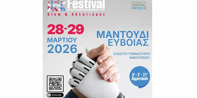 Η Περιφέρεια Στερεάς Ελλάδας διοργανώνει Φεστιβάλ Εκπαιδευτικής Ρομποτικής “RoboFestival STEM | Robotics – Coding – Engineering – Maths”, έχοντας ως βασικό θέμα την κατασκευή και τον προγραμματισμό ρομπότ με χρήση δομικών στοιχείων LEGO,που θα πραγματοποιηθεί στις 28 και 29Μαρτίου 2026, στοΜαντούδι και συγκεκριμένα στο κλειστό Γυμναστήριο Μαντουδίου.