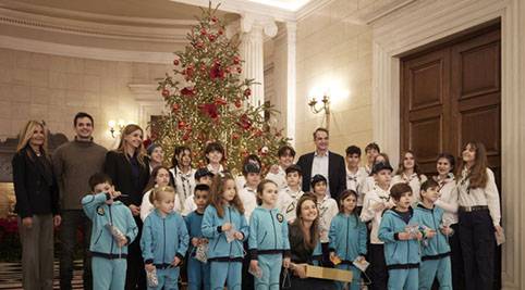 Χριστουγεννιάτικα κάλαντα από διάφορες περιοχές της χώρας άκουσαν στο Μέγαρο Μαξίμου ο Πρωθυπουργός Κυριάκος Μητσοτάκης, η σύζυγός του Μαρέβα Γκραμπόφσκι-Μητσοτάκη και τα παιδιά τους Σοφία, Κωνσταντίνος και Δάφνη.