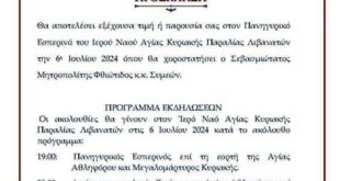Εορτασμός του Ιερού Ναού Αγίας Κυριακής Παραλίας Λιβανατών του Δήμου Λοκρών στις 6/7/2024 όπου θα χοροστατήσει ο Μητρολίτης Φθιώτιδας κ. Συμεών. Η πρόσκληση και το πρόγραμμα του εορτασμού: