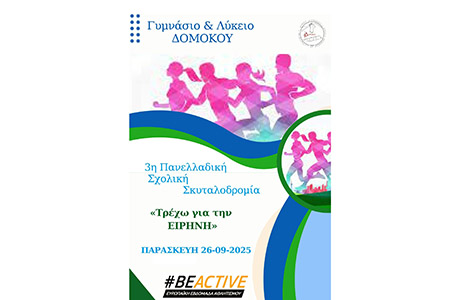 Το Γυμνάσιο και Λύκειο Δομοκού συμμετέχουν στην 3η Πανελλαδική Σχολική Σκυταλοδρομία με τίτλο «Τρέχω για την ΕΙΡΗΝΗ». Η εκδήλωση, η οποία πραγματοποιείται στο πλαίσιο της Ευρωπαϊκής Εβδομάδας Αθλητισμού (#BEACTIVE), στοχεύει στην προώθηση του αθλητικού ιδεώδους και των αξιών της ειρήνης.