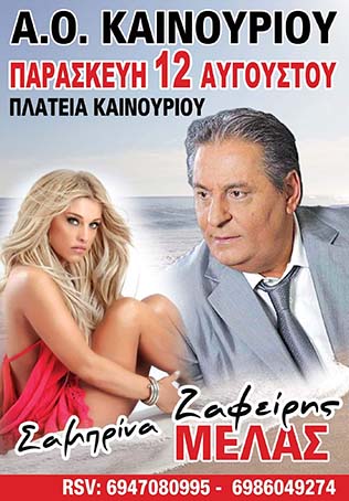 Η αφίσα-πρόσκληση από τον Α.Ο. Καινούργιου για το γλέντι που διοργανώνει την Παρασκευή 12/8/2022 στην πλατεία του χωριού με τους γνωστούς τραγουδιστές, Ζαφείρη Μελά και Σαμπρίνα.
